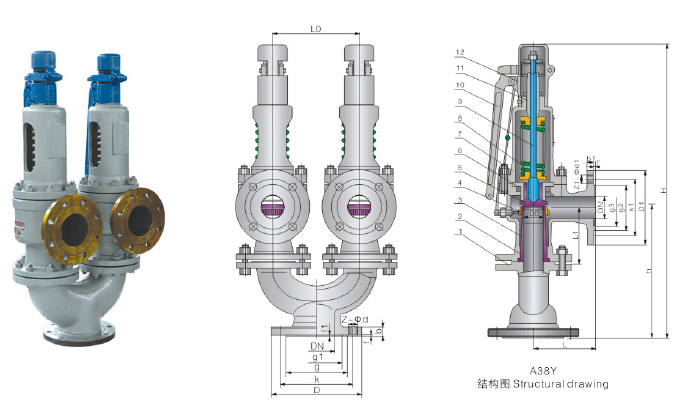 A38Y、A43H、A37H系列雙聯彈簧式安全閥是在Y型接頭上裝設兩個同樣規格的A48Y或A47H型安全閥而構成,適用于工作溫度≤350℃的蒸汽、水等介質的設備和管路上。作為超壓保護裝置。