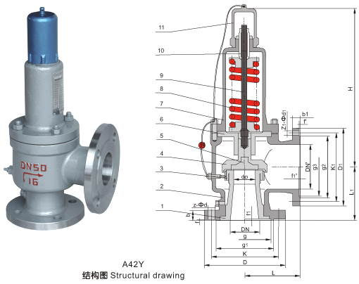 五、彈簧全啟封閉式安全閥(A42Y)剖解圖:
